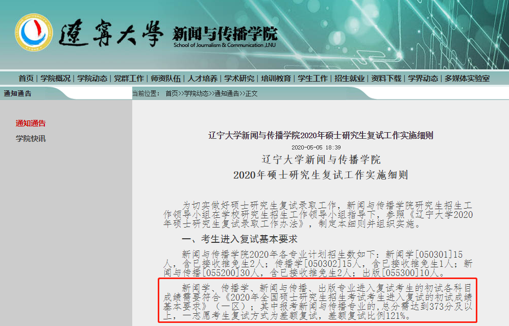 其中報考新聞與傳播專業的,總分需達到373分及以上,一志愿考生復試方式為差額復試,差額復試比例121%