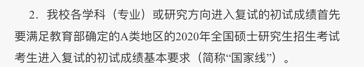 各學(xué)科(專(zhuān)業(yè))或研究方向進(jìn)入復(fù)試的初試成績(jī)首先要滿足教育部確認(rèn)的A類(lèi)地區(qū)的2020年全國(guó)碩士招生考試考生進(jìn)入復(fù)試的初試成績(jī)基本要求(簡(jiǎn)稱“國(guó)家線”)。
