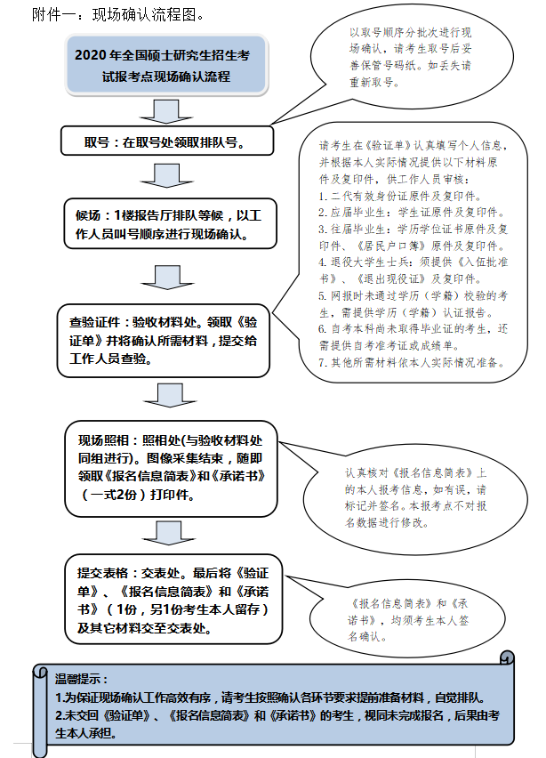 2.領(lǐng)取表格:報(bào)告廳入口處-領(lǐng)取排隊(duì)號(hào)和《2020年全國碩士研究生招生考試報(bào)名點(diǎn)現(xiàn)場(chǎng)確認(rèn)驗(yàn)證單》(1份),填寫驗(yàn)證單信息并候場(chǎng)。(注:考生需自帶書寫筆)