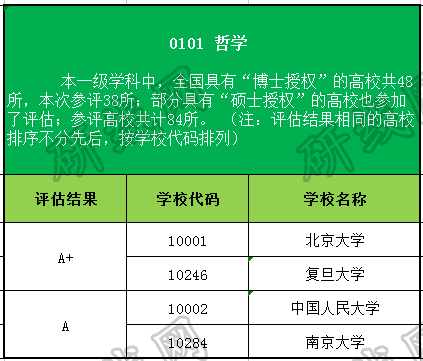 其中哲學類學科高校評估結果為A及A以上等級的學校名稱和代碼如下: