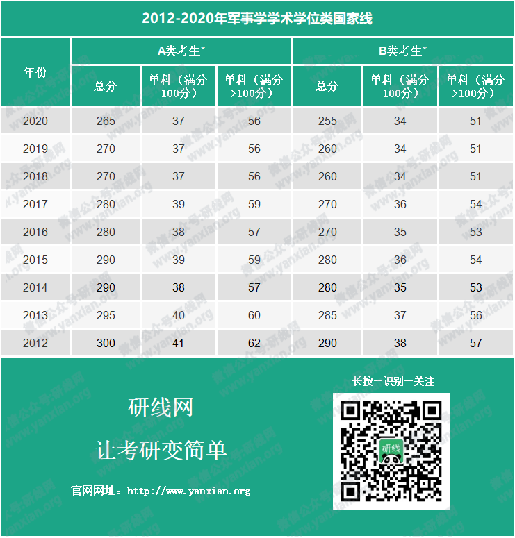 2012-2020年軍事學學術學位類國家線:
