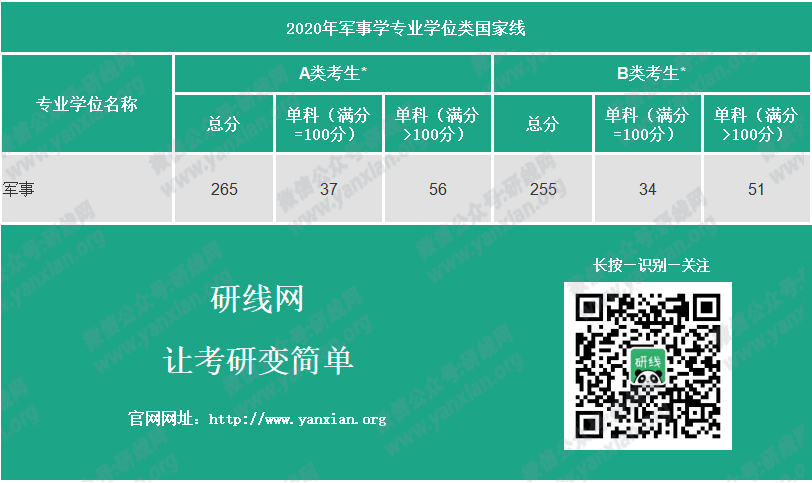 2020年軍事學專業學位類國家線: