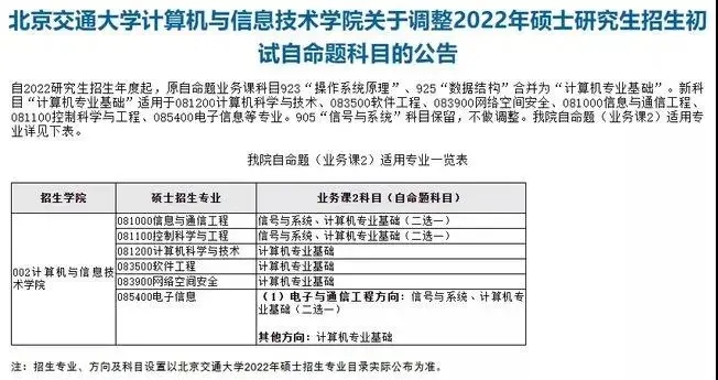 新科目“計算機專業基礎”適用于081200計算機科學與技術、083500軟件工程、083900網絡空間安全、081000信息與通信工程、081100控制科學與工程、085400電子信息等專業。905 “信號與系統”科目保留,不做調整。我院自命題(業務課2)適用專業詳見下表。