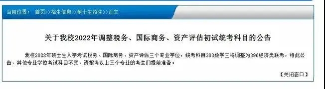 我校2022年碩士生入學考試稅務,國際商務、資產評估三個專業學位,統考科目303數學三將調整為396經濟類聯考,特此公告,其他專業學位考試科目不變,請報考以上三個專業的考生們提前準備。