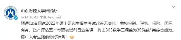 關于金融專業學位研究生入學考試初試統考科目調整的通告:我院自2022年始,金融專業學位碩士研究生入學考試統考科目303數學三調整為396經濟類聯考。