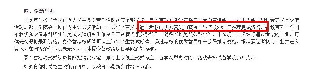 通過考核的優秀營員如未獲得推免資格,報考通過考核的專業并進入復試可在同等條件下優先錄取。具體夏令營政策以各學院通知為準。
