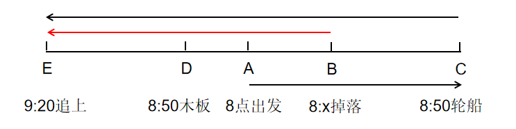 那根據追及問題的模型,船從C追了30分鐘(8:50到9:20)追到了E。木板從D漂了30分鐘(8:50到9:20)漂到了E。有: