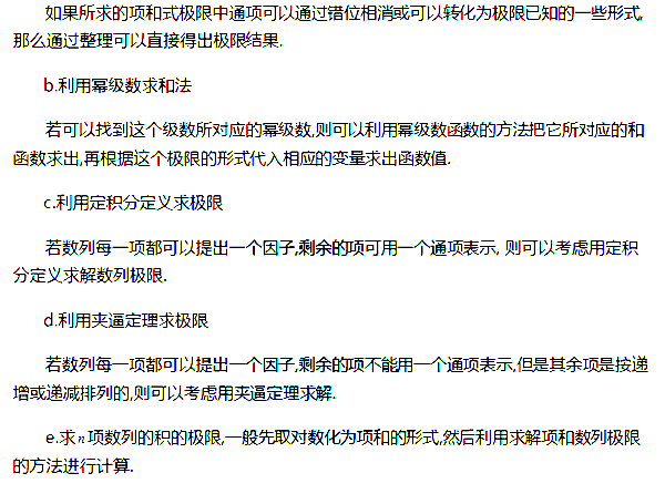 極限的計算常用方法:四則運算、洛必達法則、等價無窮小代換、兩個重要極限、利用泰勒公式求極限、夾逼定理、利用定積分求極限、單調有界收斂定理、利用連續(xù)性求極限等方法。