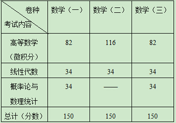 數學1、2、3之間,根據專業需求,在科目和分值上的區別見下表: