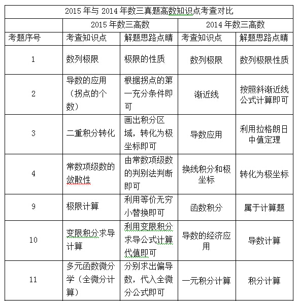 為幫助大家了解今年和去年考研數學三有什么樣的變動,下面就2015年與2014年數三真題高數知識點作如下分析: