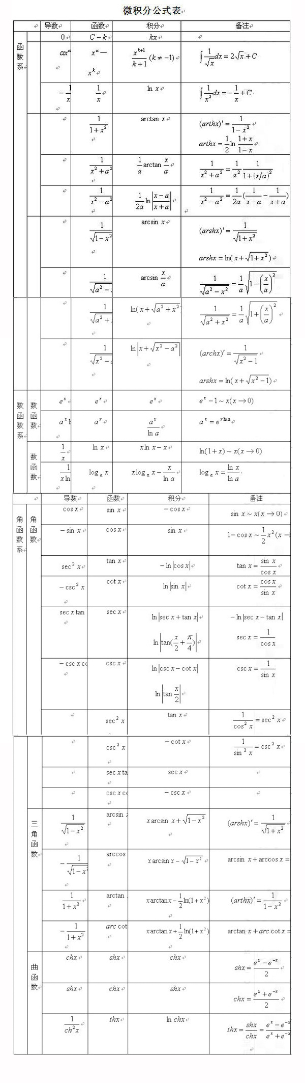 左一個公式,右一個公式,看的復習數學的你是否頭痛?數學是邏輯思維和各種公式的碰撞,可是繁雜的公式除了挑戰邏輯思維,還挑戰了記憶力。好多視數學如猛虎的同學有一半以上都會被紛雜的公式繞的頭疼。小編貼心總結微積分會用到的公式,并以表格形式呈現,是大家看得舒心記得方便。
