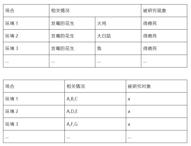 1960年,英國(guó)某農(nóng)場(chǎng)十萬(wàn)只火雞和小鴨吃了發(fā)霉的花生,在幾個(gè)月內(nèi)得癌癥死了。后來(lái),用這種花生喂羊、貓、鴿子等動(dòng)物,又發(fā)生了同樣的結(jié)果。1963年,有人又用發(fā)了霉的花生喂大白鼠、魚(yú)和雪貂,也都紛紛得癌而死,上述各種動(dòng)物患癌癥的前提條件中,對(duì)象、時(shí)間、環(huán)境都不同,唯一共同的因素就是吃了發(fā)霉的花生。于是,人們推斷:吃了發(fā)霉的花生可能是這些動(dòng)物得癌死亡的原因。后來(lái)通過(guò)化驗(yàn)證明,發(fā)霉的花生內(nèi)含黃曲霉素,黃曲霉素是致癌物質(zhì)。這就是“求同”。