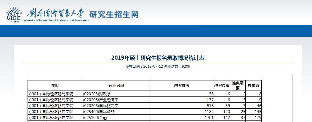 對(duì)外經(jīng)濟(jì)貿(mào)易大學(xué)2019年碩士研究生報(bào)名錄取情況統(tǒng)計(jì)表