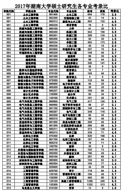 考研報錄比是考生在擇校擇專業時關注的重點內容之一,因此考研報錄比成為考生衡量報考難度的重要因素。為了節省考生們的時間,小編整理了湖南大學2017年考研報錄比,希望能對大家有所幫助。