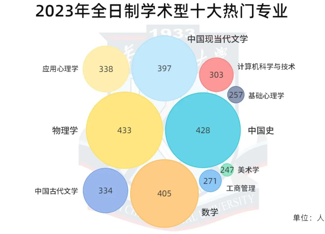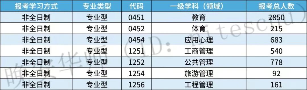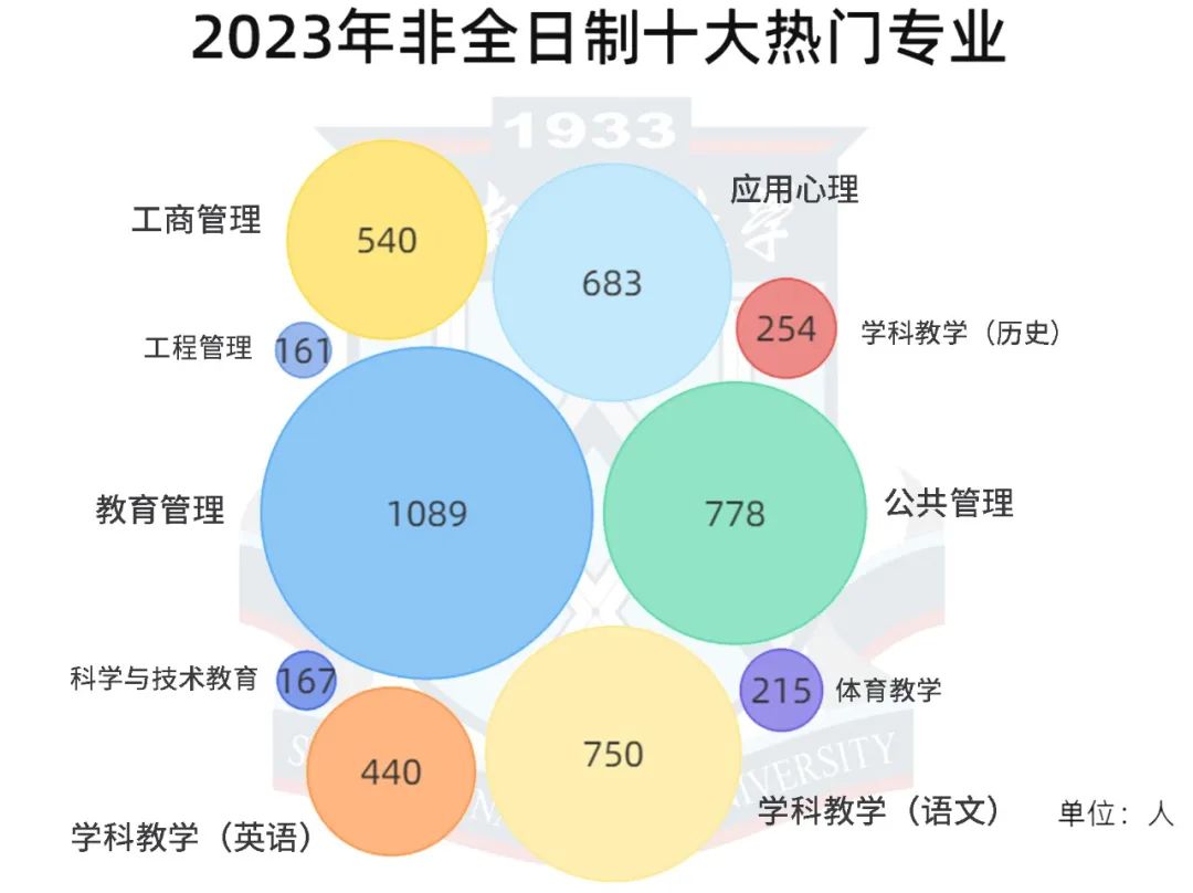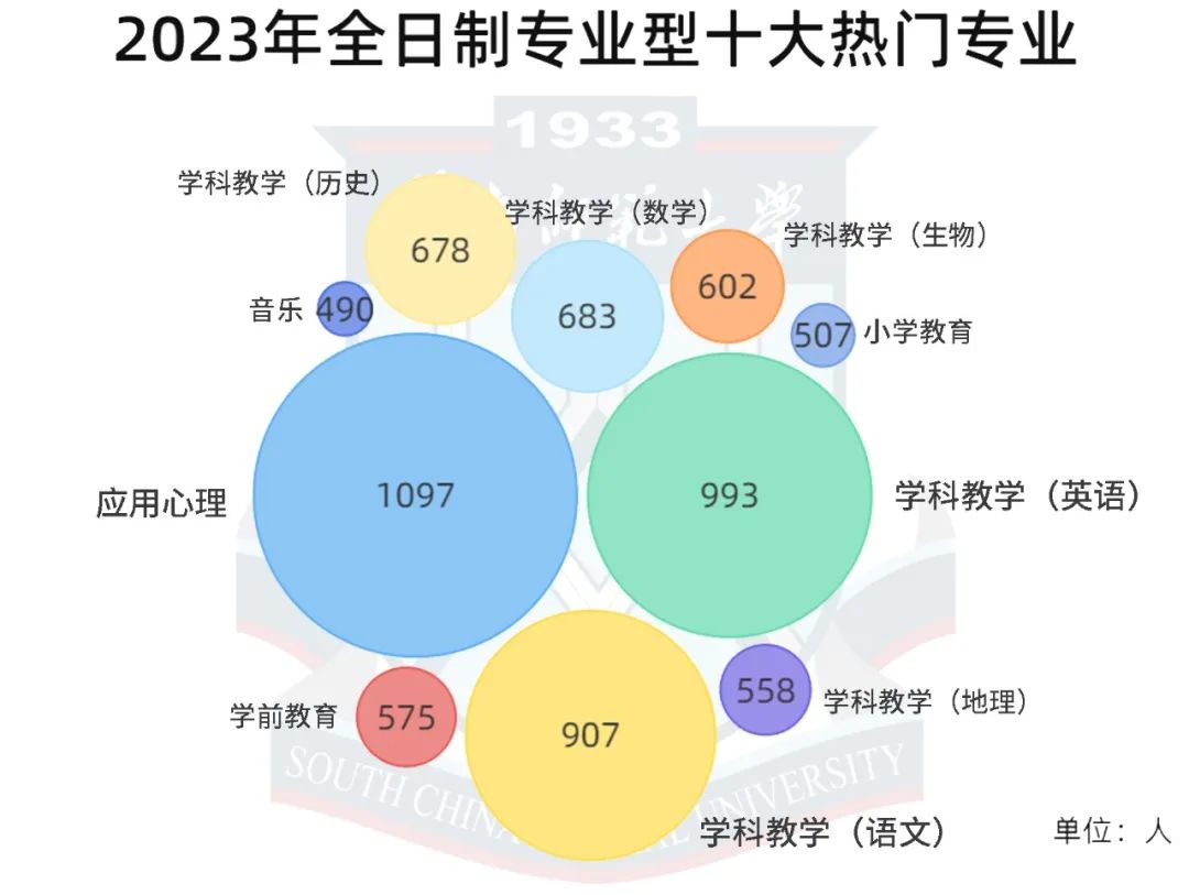 2023年,報考華師全日制一級學科(領域)的總人數為23876人,學術型的報考人數為8839人,專業型的報考人數為20356人。其中,有7個全日制一級學科(領域)報考人數超過800人:教育(專業型)報考人數高達8093人,電子信息(專業型)報考人數為1737人,中國語言文學(學術型)報考人數為1187人,應用心理(專業型)報考人數為1097人,藝術(專業型)報考人數為879人,心理學(學術型)報考人數為869人,教育學(學術型)報考人數為858人。