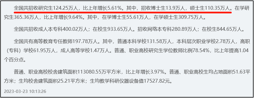 “全國共招收研究生124.25萬人,比上年增長5.61%。其中,招收博士生13.9萬人,碩士生110.35萬人。”