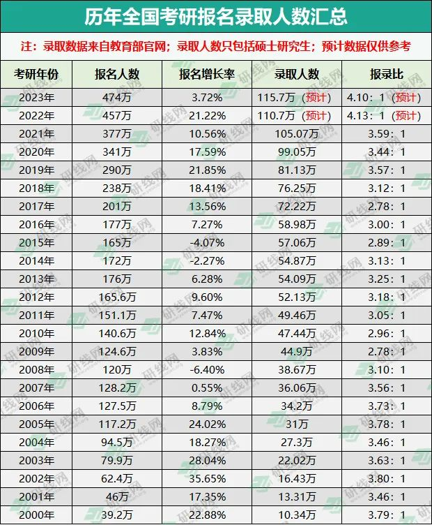 之前研線網曾預測“2022年碩士生招生預計110.70萬,2022年考研報錄比預計為4.13:1”,和上面的數據相差無幾。下圖為之前研線網預測的報考錄取情況,2023年考研錄取人數和報錄比暫未公布,僅供參考。