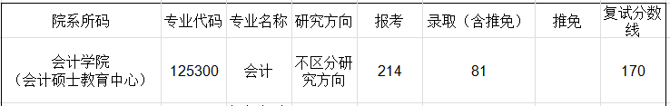 會計碩士報考人數為:214,錄取人數(含推免)為:81,綜合計算,報錄比為:3:1