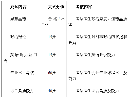 復試內容包括:思想品德考核、政治理論考核、英語聽力及口語考核、專業(yè)水平考核、綜合素質能力考核五項,復試滿分130分。