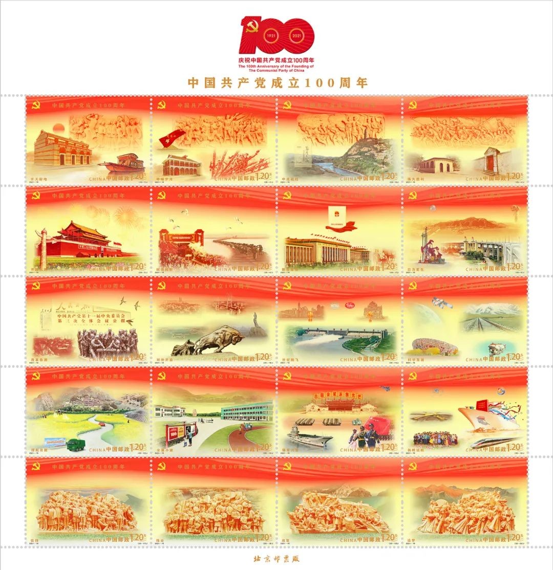 2.中國郵政將于2021年7月1日發行《中國共產黨成立100周年》紀念郵票1套20枚,紀念封1套1枚。