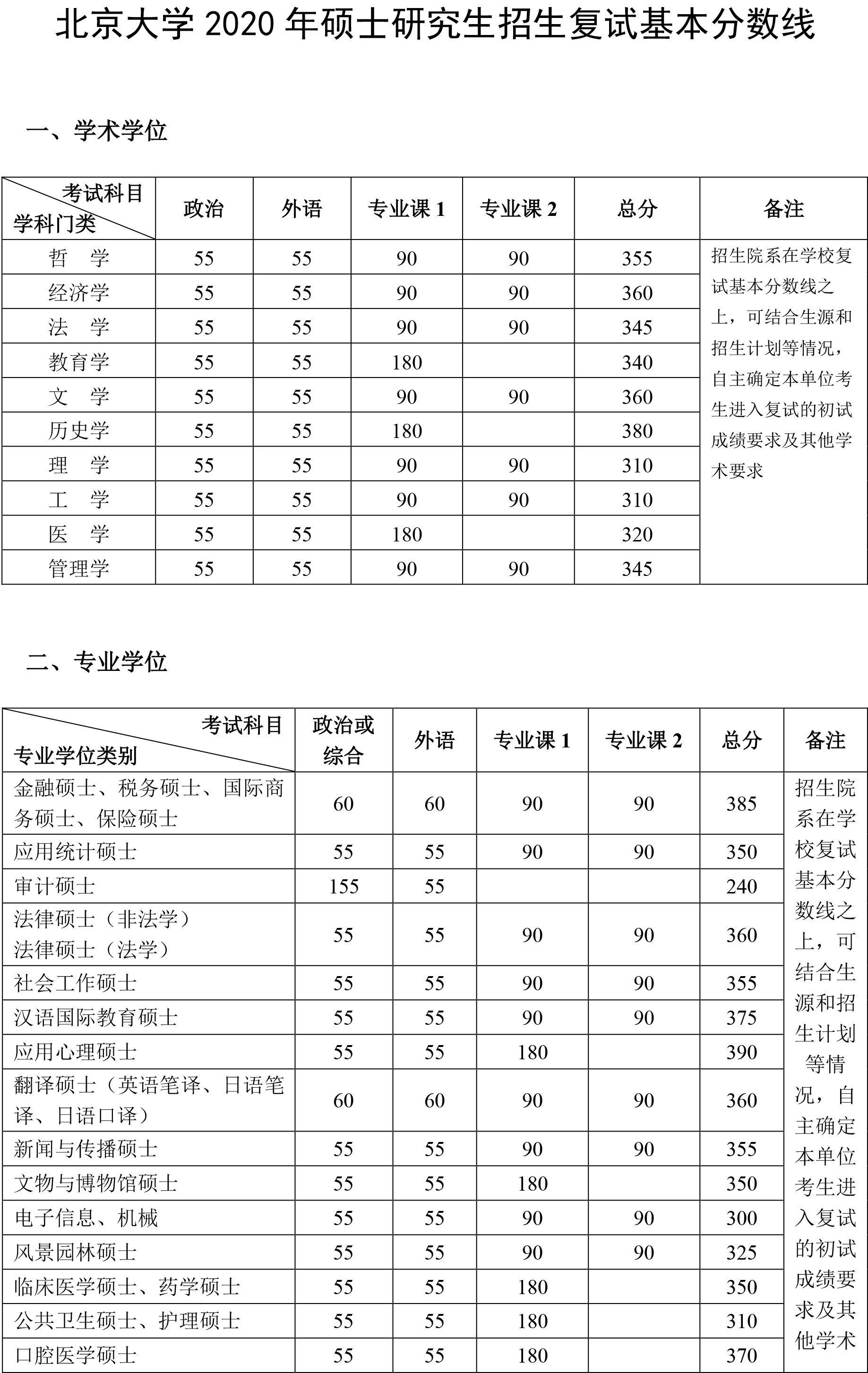 2020考研分數線:北京大學2020年碩士研究生復試基本分數線公布!