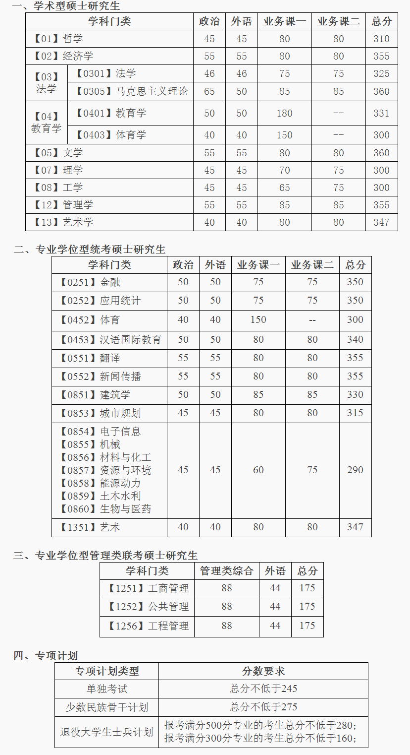 根據(jù)教育部相關(guān)文件精神,結(jié)合我校實際情況,經(jīng)學校招生工作領(lǐng)導小組討論研究決定,我校2020年全國碩士研究生招生考試考生進入復(fù)試的初試成績基本要求如下:
