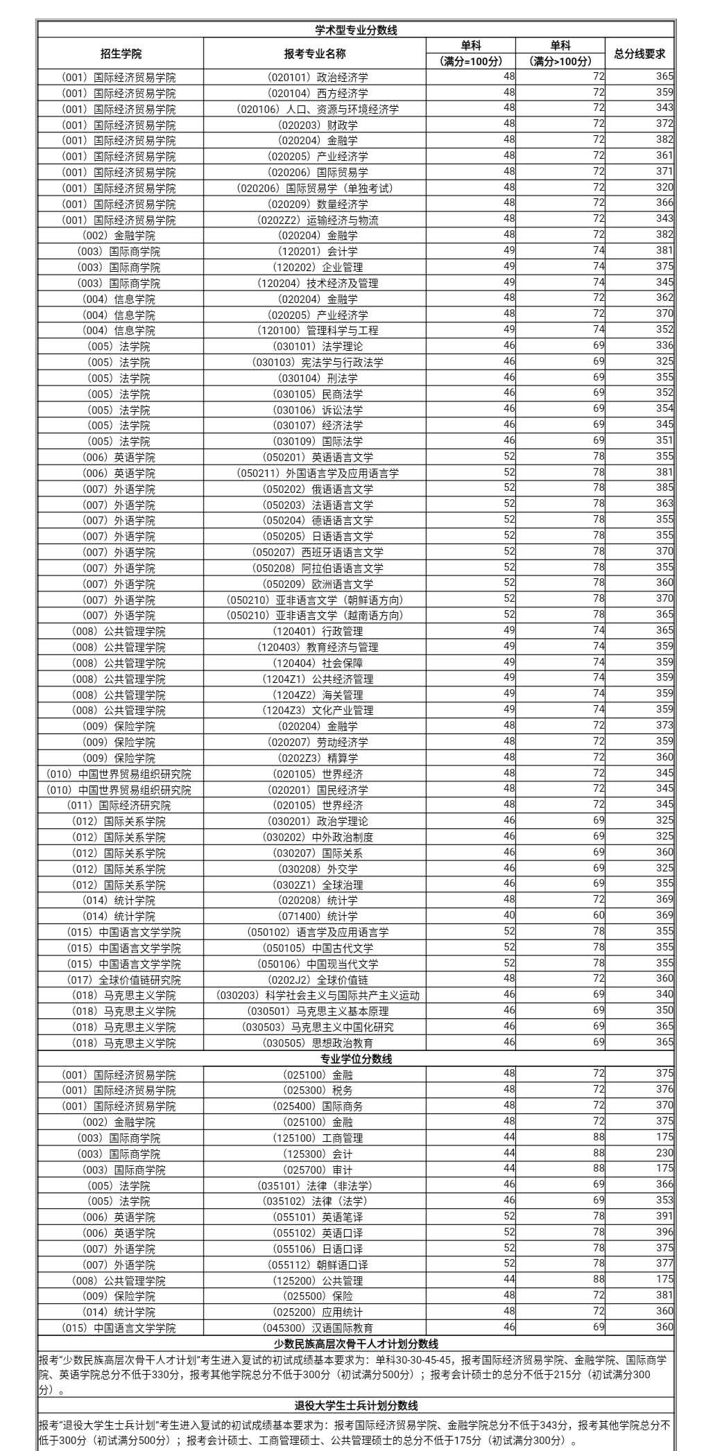 根據2020年我校碩士研究生初試成績統計結果和各學科專業擬招生計劃,在《2020年全國碩士研究生招生考試考生進入復試的初試成績基本要求》基礎上,經學校研究生招生工作領導小組討論決定,對外經濟貿易大學2020年碩士研究生招生考試考生進入復試的初試成績基本要求如下: