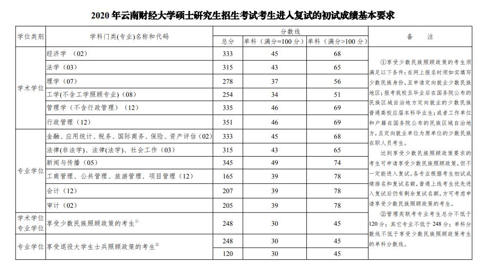 以上就是有關(guān)“2020考研分?jǐn)?shù)線:云南財(cái)經(jīng)大學(xué)2020年碩士研究生招生考試考生進(jìn)入復(fù)試的初試成績(jī)基本要求”的全部?jī)?nèi)容了,進(jìn)入復(fù)試的同學(xué)一定要好好準(zhǔn)備,在國(guó)家線徘徊的同學(xué)抓緊準(zhǔn)備調(diào)劑了!