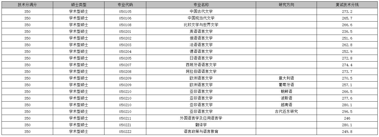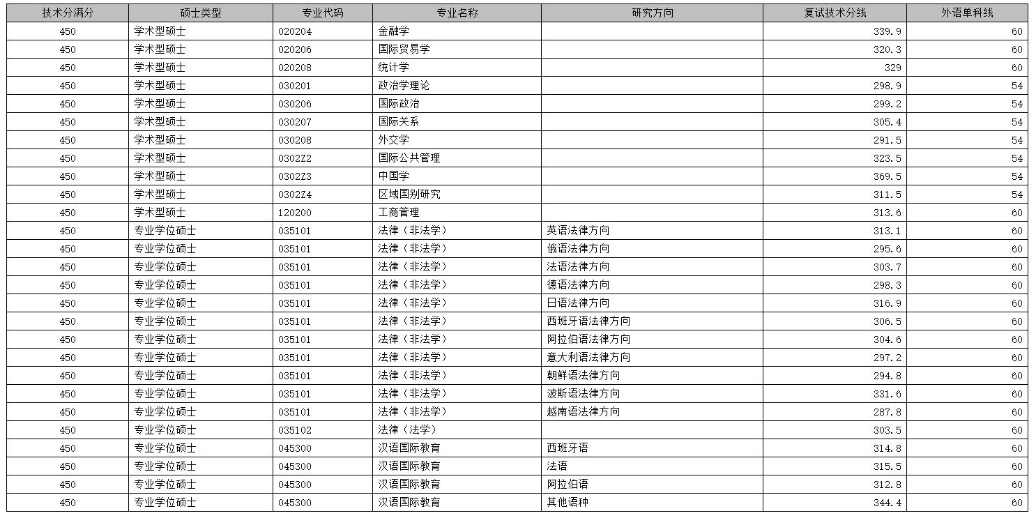(2)技術分計算公式按“ 業務1+業務2+外語+總分*10%”計算,且設外語成績單科線的專業復試技術分線和外語單科線:(滿分為450分)