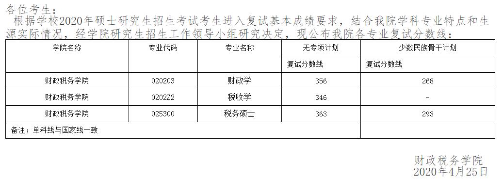 2020考研分?jǐn)?shù)線:中南財(cái)經(jīng)政法大學(xué)財(cái)政稅務(wù)學(xué)院2020年碩士研究生招生考試復(fù)試分?jǐn)?shù)線公告