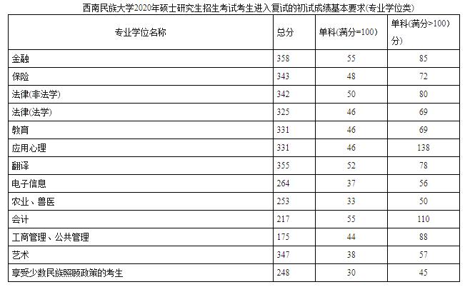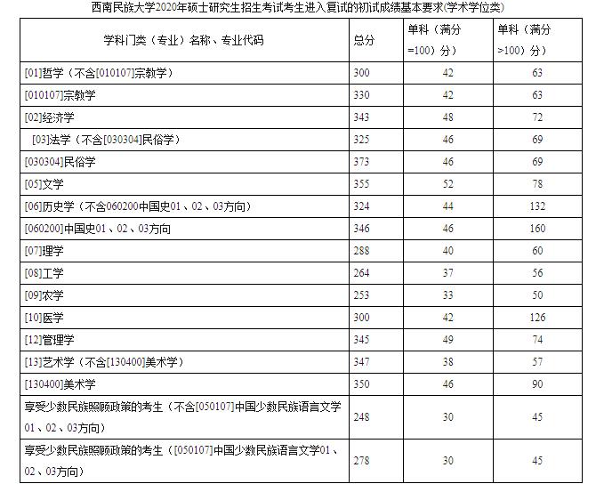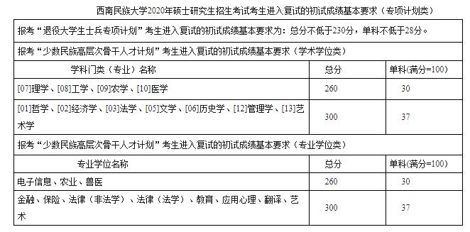 以上就是有關“2020考研分數線:西南民族大學2020年碩士研究生招生考試考生進入復試的初試成績基本要求的通知”的全部內容了,進入復試的同學一定要好好準備,在國家線徘徊的同學抓緊準備調劑了!