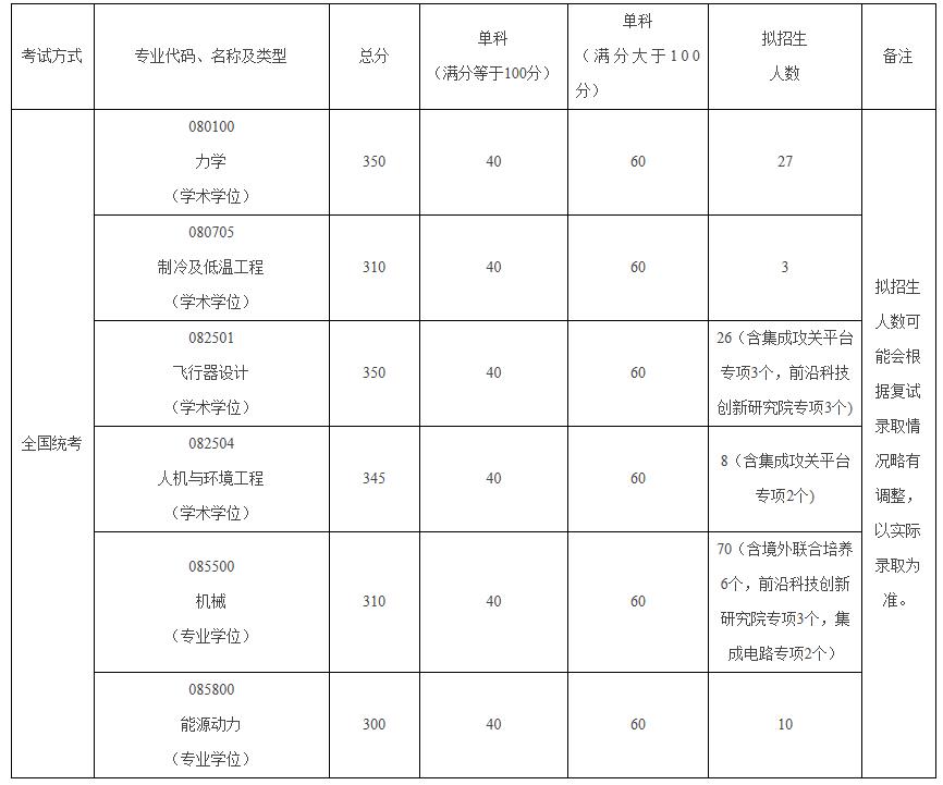 2. 我院080100力學(xué)、080705制冷及低溫工程、082501飛行器設(shè)計(jì)、082504人機(jī)與環(huán)境工程、085800能源動(dòng)力等專(zhuān)業(yè)復(fù)試實(shí)行按專(zhuān)業(yè)和研究方向分組復(fù)試。