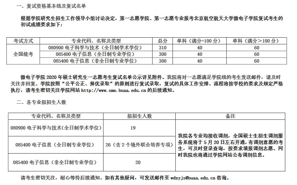 以上就是有關“2020考研分數線:北京航空航天大學微電子學院2020年碩士研究生復試資格線、復試名單及擬招生人數公示”的全部內容了,進入復試的同學一定要好好準備,在國家線徘徊的同學抓緊準備調劑了!