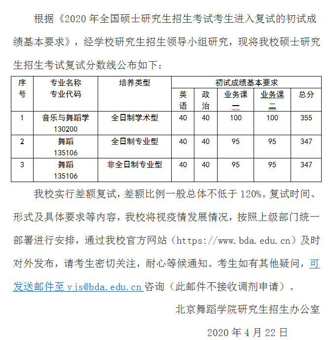 原標題:北京舞蹈學院2020年碩士研究生招生考試復試分數線