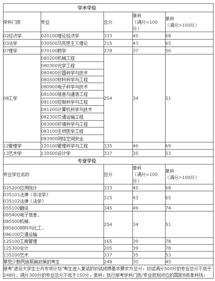 我校除會計碩士外,其余招生學科(專業領域)復試分數線均執行“2020年全國碩士研究生招生考試考生進入復試的初試成績基本要求(B類考生)”,具體如下: