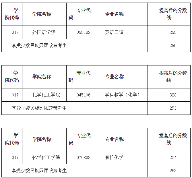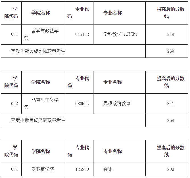 根據(jù)《教育部關(guān)于印發(fā)<2020年全國碩士研究生招生工作管理規(guī)定>的通知》(教學(xué)〔2019〕6號)、《2020年全國碩士研究生招生考試考生進(jìn)入復(fù)試的初試成績基本要求》(2020年國家線)、《教育部辦公廳關(guān)于做好2020年全國碩士研究生復(fù)試工作的通知》(教學(xué)廳〔2020〕4號)等文件要求,以及上級部門的相關(guān)規(guī)定和關(guān)于統(tǒng)籌全日制、非全日制招生的相關(guān)要求,結(jié)合我校生源及招生計劃情況,提高以下上線人數(shù)較多專業(yè)的復(fù)試分?jǐn)?shù)線(不涉及退役大學(xué)生士兵專項計劃考生)。