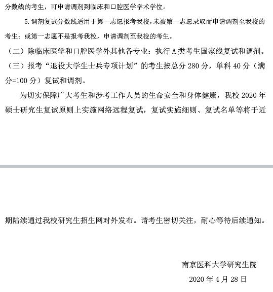 分數線,南京醫科大學也公布了2020年碩士研究生招生復試
