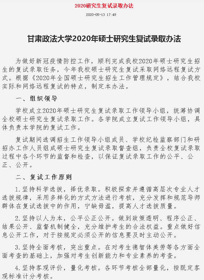 原標題:2020年甘肅政法大學碩士研究生復試錄取辦法