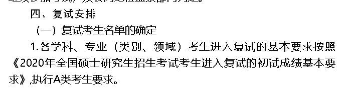 1.各學(xué)科、專業(yè)(類別、領(lǐng)域)考生進(jìn)入復(fù)試的基本要求按照《2020年全國碩士研究生招生考試考生進(jìn)入復(fù)試的初試成績基本要求》,執(zhí)行A類考生要求。