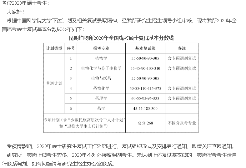 原標題:昆明植物所2020年全國統考碩士復試基本分數線