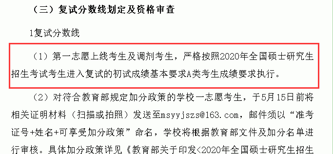 (2)對符合教育部規定加分政策的學校一志愿考生,于5月15日前將相關證明材料(掃描或拍照)發送至msyyjszs@163.com,郵件須以“準考證號+姓名+可享受加分政策”命名,學校將根據教育部文件及加分名單進行審核。具體加分政策詳見《教育部關于印發<2020年全國碩士研究生招生工作管理規定>的通知》。(申請調劑考生可在提交調劑申請前發送以上材料)。