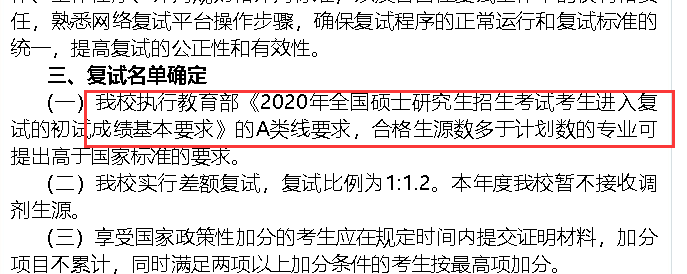 (一)我校執行教育部《2020年全國碩士研究生招生考試考生進入復試的初試成績基本要求》的A類線要求,合格生源數多于計劃數的專業可提出高于國家標準的要求。