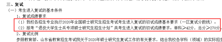 (2)報考“退役大學生士兵專項碩士研究生招生計劃”類考生進入復試的初試成績要求:單科≥42分,總分≥270分。