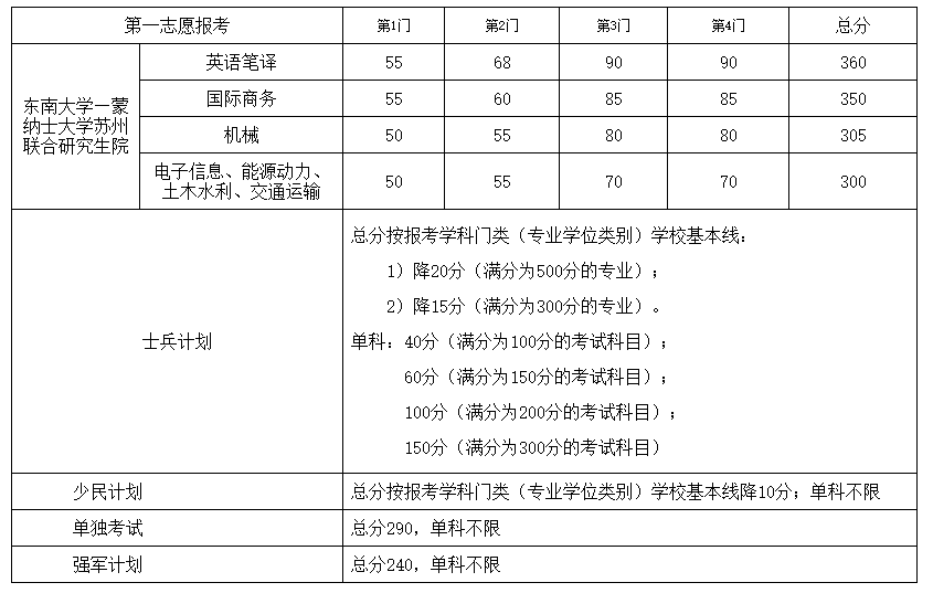 2. 統(tǒng)考考生(不含報考東南大學(xué)-蒙納士大學(xué)蘇州聯(lián)合研究生院考生和管理類聯(lián)考考生)總分超過報考院(系)專業(yè)復(fù)試線20分以上(含20分),單科(限一門)可降2分。