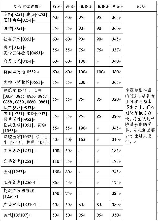 1.總分成績要求:依據(jù)所報(bào)考專業(yè)在上表中復(fù)試分?jǐn)?shù)線基本要求的總分降低19%。