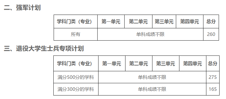 單科成績(jī)不限,總分不低于對(duì)應(yīng)統(tǒng)考的學(xué)科門(mén)類(lèi)(專(zhuān)業(yè))學(xué)校分?jǐn)?shù)線的90%(四舍五入取整)。
