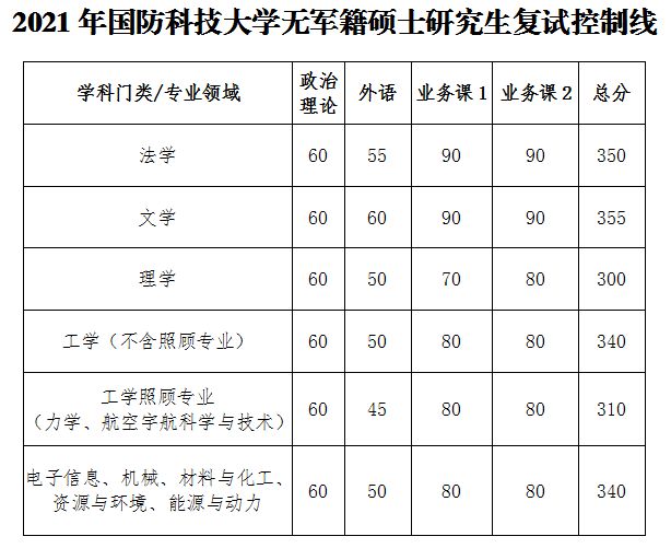 現(xiàn)公布國(guó)防科技大學(xué)2021年無(wú)軍籍碩士研究生招生復(fù)試控制線,軍人碩士研究生招生復(fù)試控制線待上級(jí)政策明確后公布。
