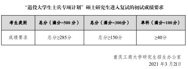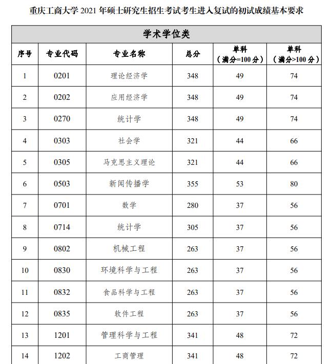 根據(jù)教育部公布的“2021年全國碩士研究生招生考試考生進(jìn)入復(fù)試的初試成績基本要求”及《2021年全國碩士研究生招生工作管理規(guī)定》(教學(xué)函〔2020〕8號)等文件精神,結(jié)合我校專業(yè)特色和生源情況,經(jīng)學(xué)校招生工作領(lǐng)導(dǎo)小組審定,現(xiàn)公布我校 2021 年碩士研究生招生考試考生進(jìn)入復(fù)試的初試成績基本要求,復(fù)試具體安排及相關(guān)要求將根據(jù)招生工作進(jìn)展及時(shí)公布,請考生密切關(guān)注重慶工商大學(xué)研究生招生辦公室網(wǎng)頁相關(guān)通知。