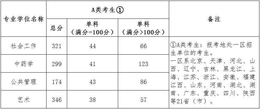 根據教育部公布的《2021年全國碩士研究生招生考試考生進入復試的初試成績基本要求(專業(yè)學位類)》,我校社會工作碩士、中藥學碩士、公共管理碩士及藝術碩士,均按照此要求中A類考生的總分及單科分數要求劃定復試名單。報考同一專業(yè)的全日制學習方式考生和非全日制學習方式考生分數要求相同。具體分數要求見下表: