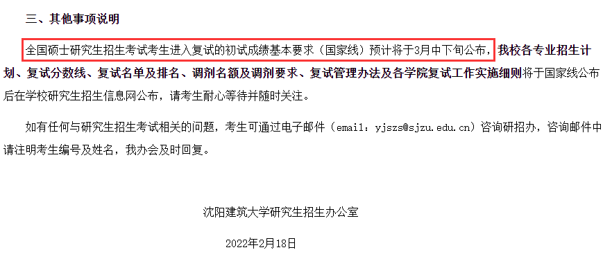 以上就是小編整理的“2022考研分數(shù)線:沈陽建筑大學碩士研究生招生考試初試成績預計將于3月中下旬公布"的全部內容。想了解更多考研相關信息,請持續(xù)關注本網站。